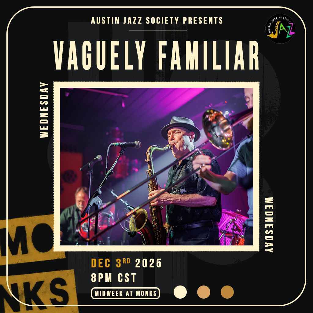 Saxman Steven Vague leads the funky jazz group Vaguely Familiar. The group is comprised of the rhythm and horn sections of Austin’s long-running funky music group: Extreme Heat. Vaguely Familiar features Ken Mills on trombone and Marty Van Blair on keyboards and trumpet. Eddie Cantu is on drums, James Fenner on percussion, David Evertson on bass, and Mike Barnes on guitar. Vaguely Familiar’s mission is to explore the funky side of jazz.